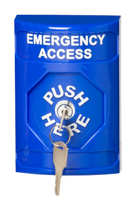 This Emergency Access Button, with a key switch to reset, is mounted outside a Laser Sentry™ access-controlled room. When pushed, accessories connected to the Laser Sentry™ are deactivated.