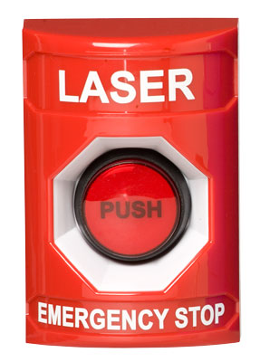 This Emergency Stop/Fire Switch is mounted inside a room controlled by a Laser Sentry™. When pushed, accessories connected to the Laser Sentry™ are deactivated and access to the room is possible.