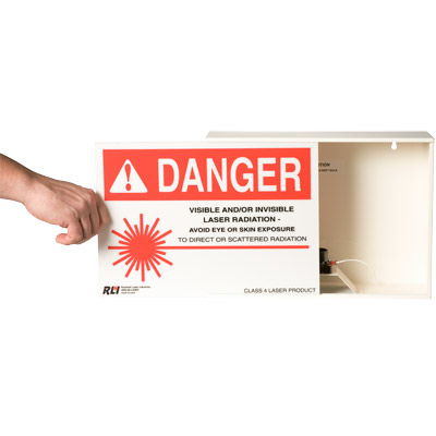 The Illuminator™ lighted sign box provides a convenient way to provide an illuminated laser warning in a laser facility. This is a rear-mounted traditional metal lighted sign box designed for holding and back-lighting RLI translucent acrylic warning signs.